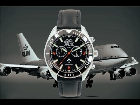 This modern timepiece features a carefully crafted stainless steel case and displays an original artifact from a KLM 747 airframe. The movement is a precision Swiss made chronograph with a Super Luminova dial protected by a scratch-resistant sapphire crystal. This design is limited to 1986 units in honor of the year KLM 747 Tail # PH-BUW entered service. The 747 was the original "Jumbo Jet" and has been considered the "queen of the skies" since it first entering service with Pan American Airlines in 1970. Now fading from passenger service, this aircraft holds a special place in the hearts of the countless passengers and crew that have flown aboard this icon.