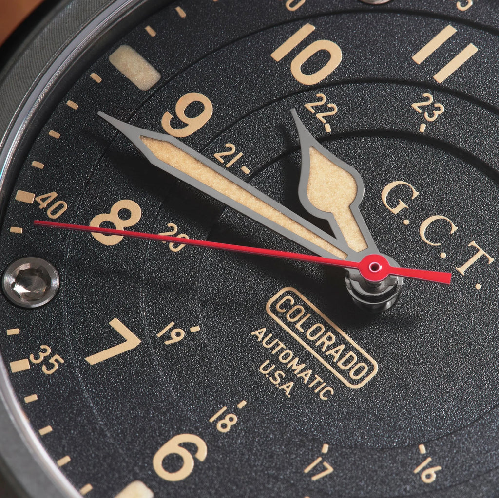 The 42mm diameter, 13mm thick stainless steel case was cut from a block of metal in Colorado with you in mind. We inlayed the case-back to make it very comfortable and stonewashed the case so it shows less wear. We added heavy knurling to the crown to make it easy to wind, and yes, it's a screw-down crown to increase the water resistance! The GCT features an automatic movement with 42 hours of power reserve though, so you won't have to wind it often, but you might want to since it feels so smooth...