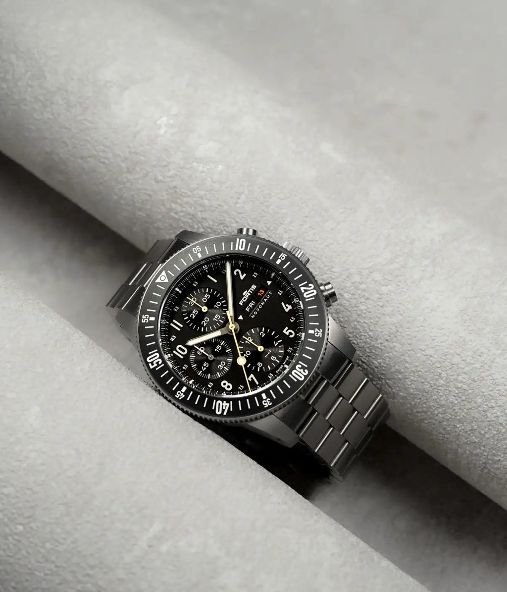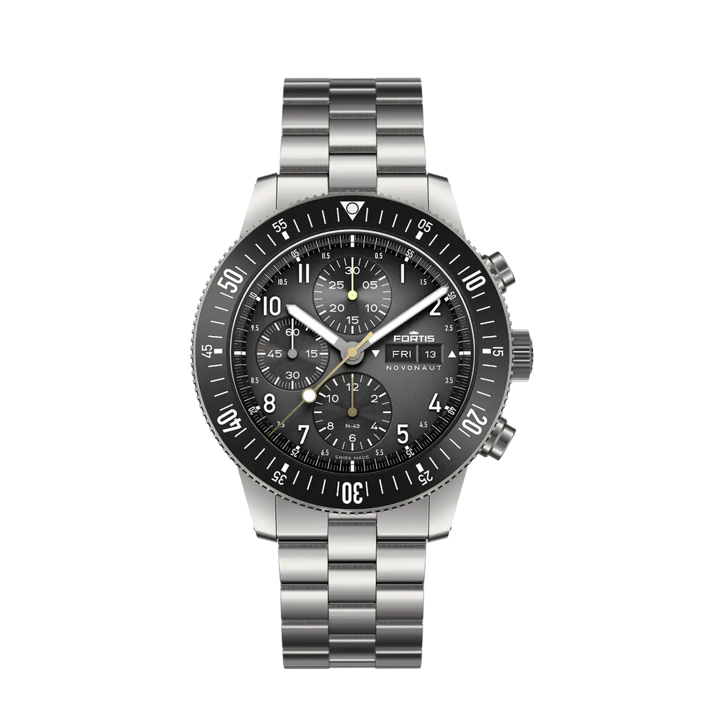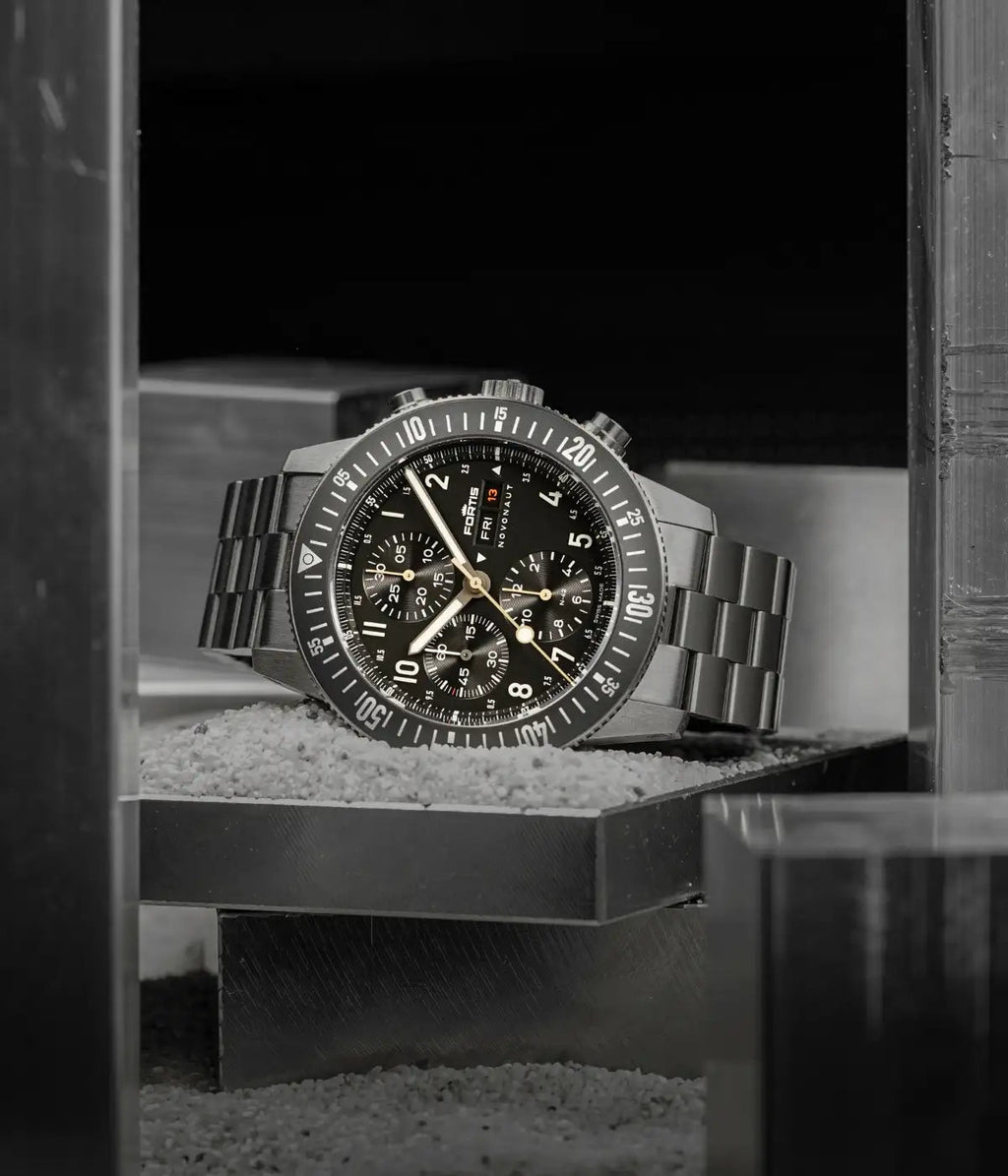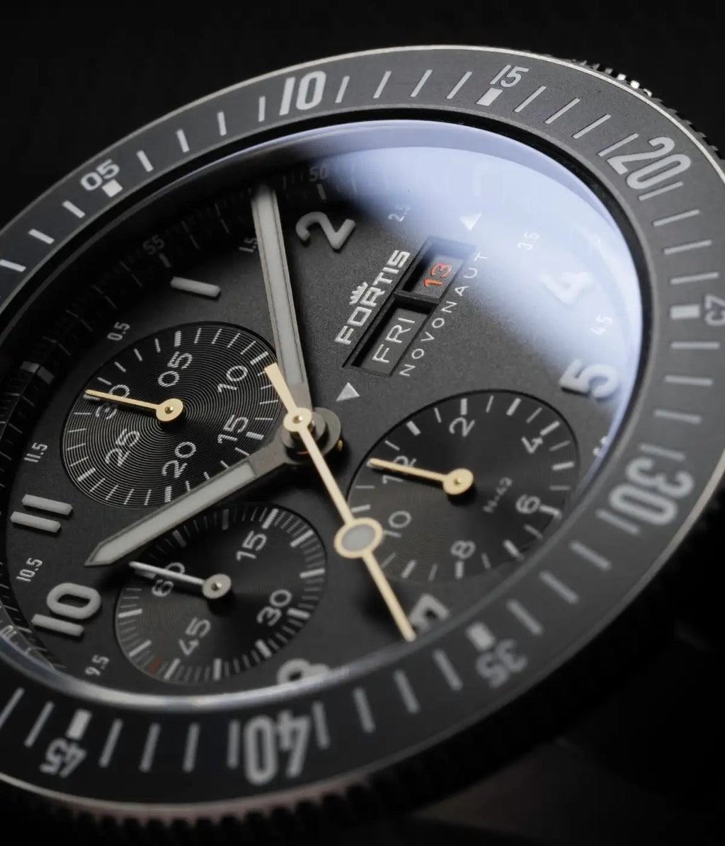 THE NOVONAUT TITANIUM LEGACY EDITION IS BUILT TO WITHSTAND IT ALL. SPACE-TESTED IN THE HARSHEST CONDITIONS, FEATURING A MATTE BLACK DIAL, GOLDEN HANDS, A MATTE BLACK CERAMIC BEZEL, AND POWERED BY THE WERK 17 MANUFACTURE CALIBRE WITH A 60-HOUR POWER RESERVE.