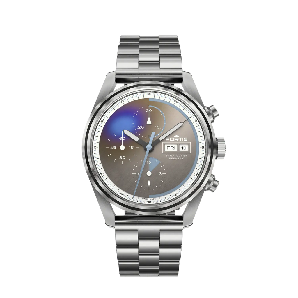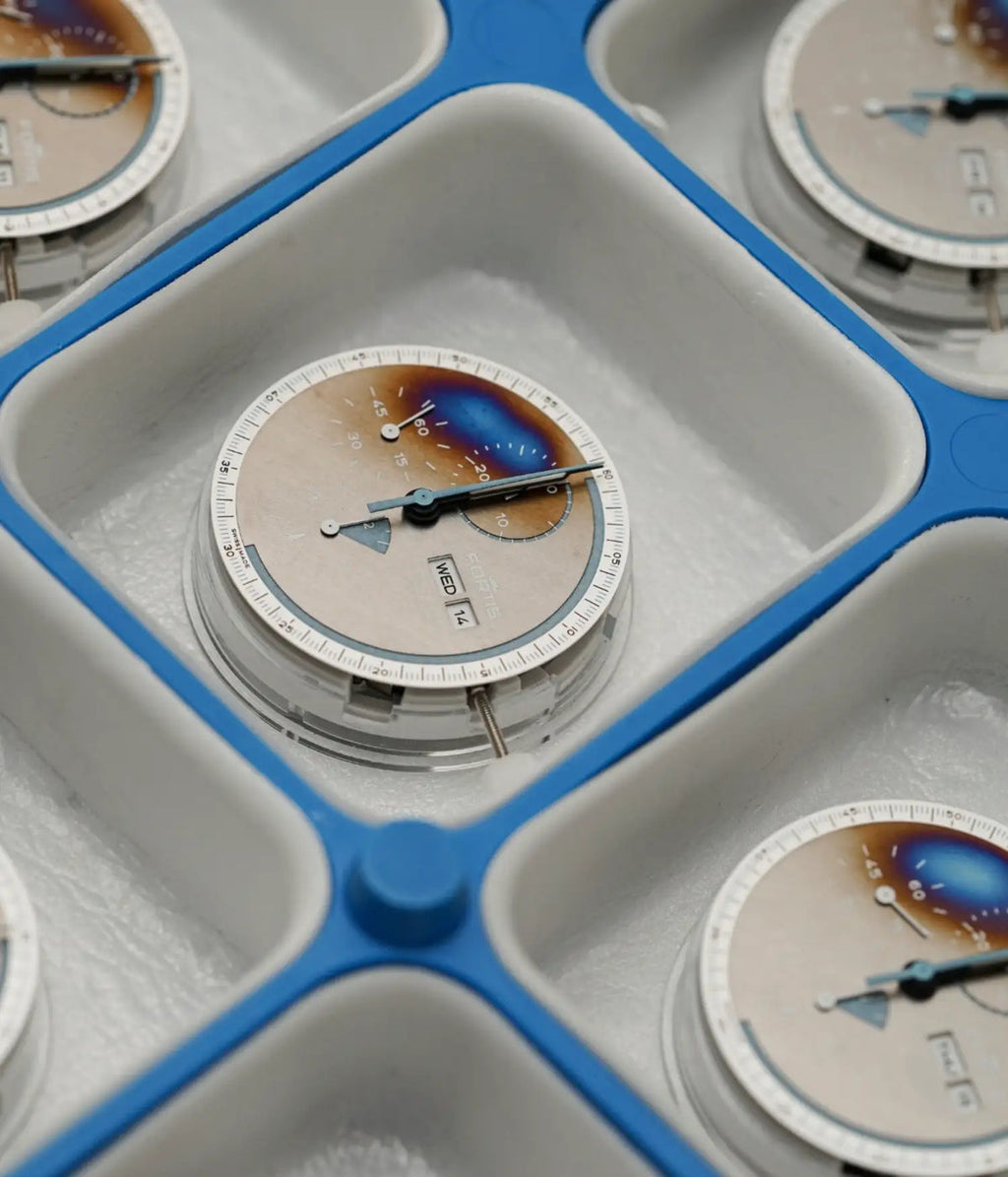Every dial is heat-treated by hand using an open flame. The result? Unpredictable tones – from deep blue to burnt orange and violet. No two dials are alike. Each one captures a singular moment shaped by heat, time and human instinct.