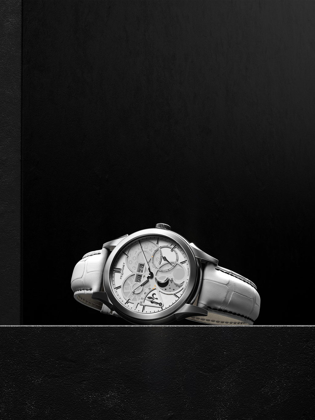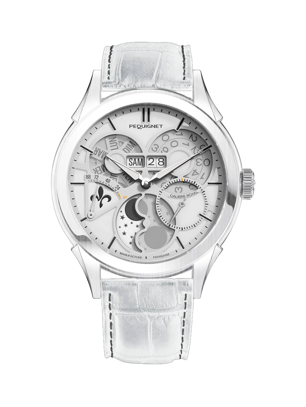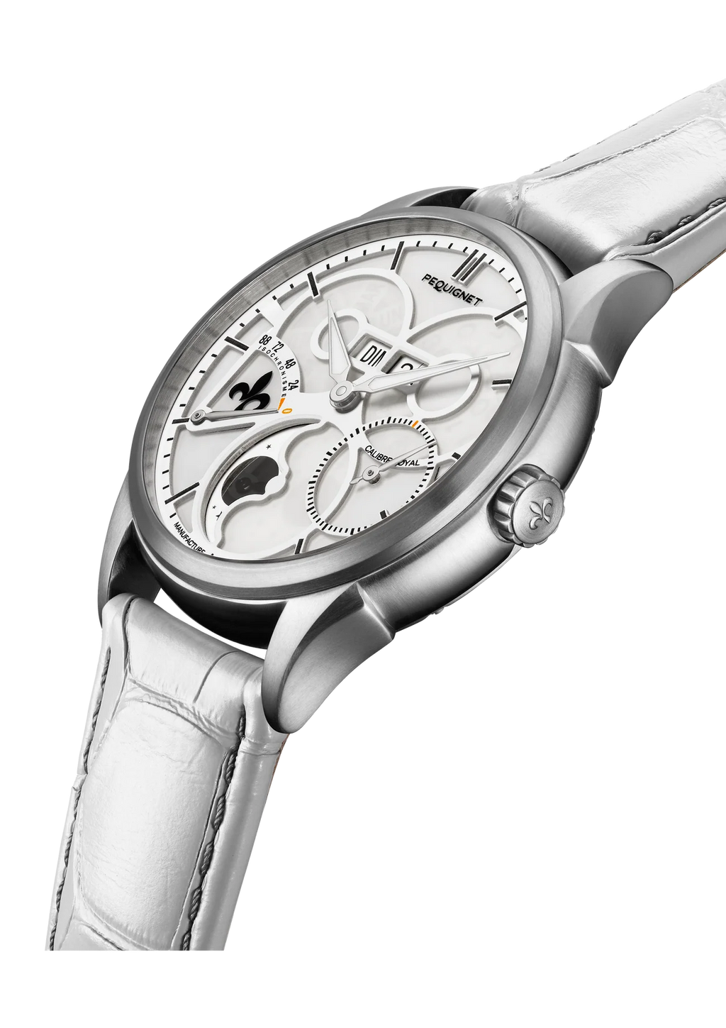 The Royale Collection is operated by the Calibre Royal®, conceived, prototyped, controlled and assembled in the Pequignet Haute Horlogerie laboratories in Morteau. Its design required no less than 279 business plans; it is made of 318 components, 316 of which were designed specifically by our company. With 8 international patents, Calibre Royal® is a real masterpiece of innovation... and 100% French!