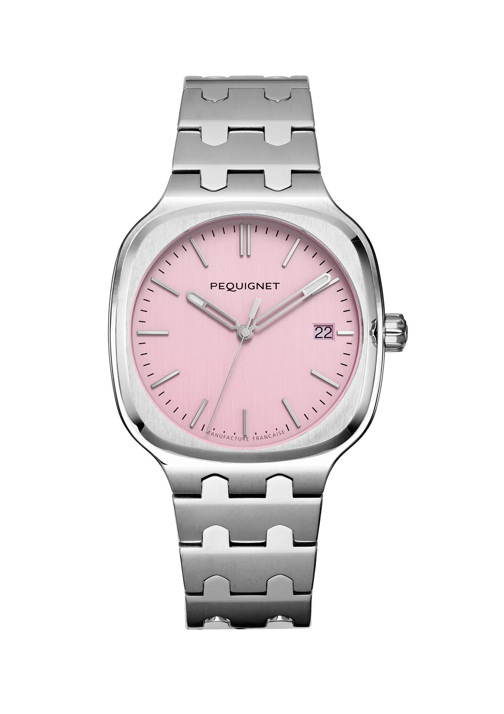 This soft pink model from the Concorde collection gently entices us to admire its dial. With this sport-chic model, the French Manufacture Pequignet reinterprets all the strong codes of the Maison: steel, the signature link, and of course, a movement designed and assembled in France.