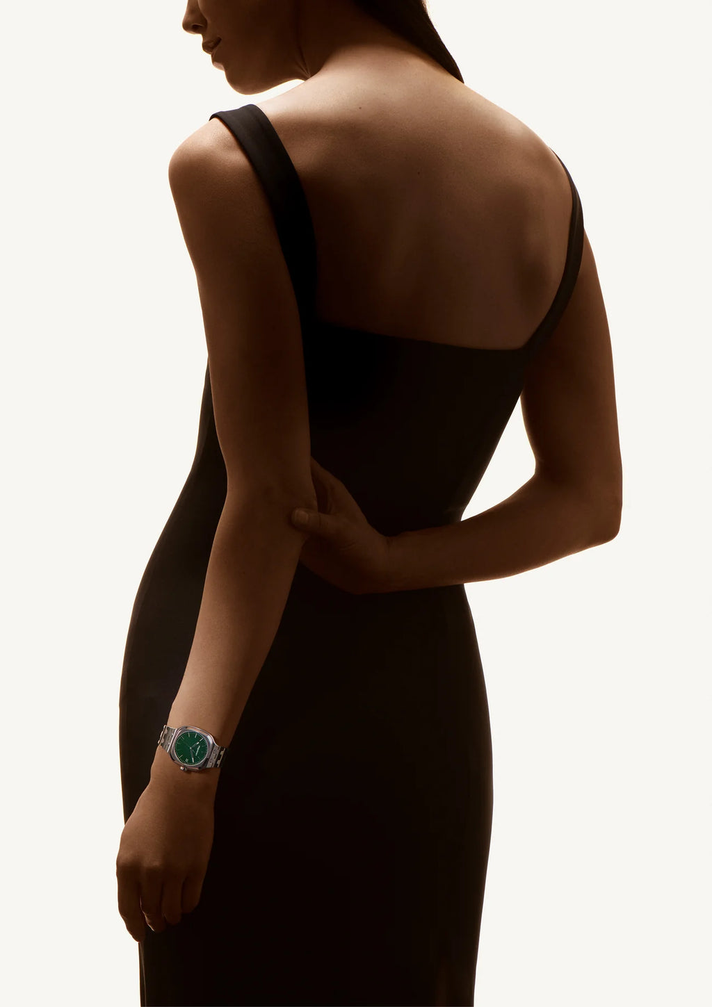 The Concorde adorns itself with a splendid Imperial Green dial, framed by a bezel entirely set with diamonds, for a most sophisticated effect. With this sport-chic model, the French Manufacture Pequignet reinterprets all the strong codes of the Maison: steel, the signature link, and of course, a movement designed and assembled in France.