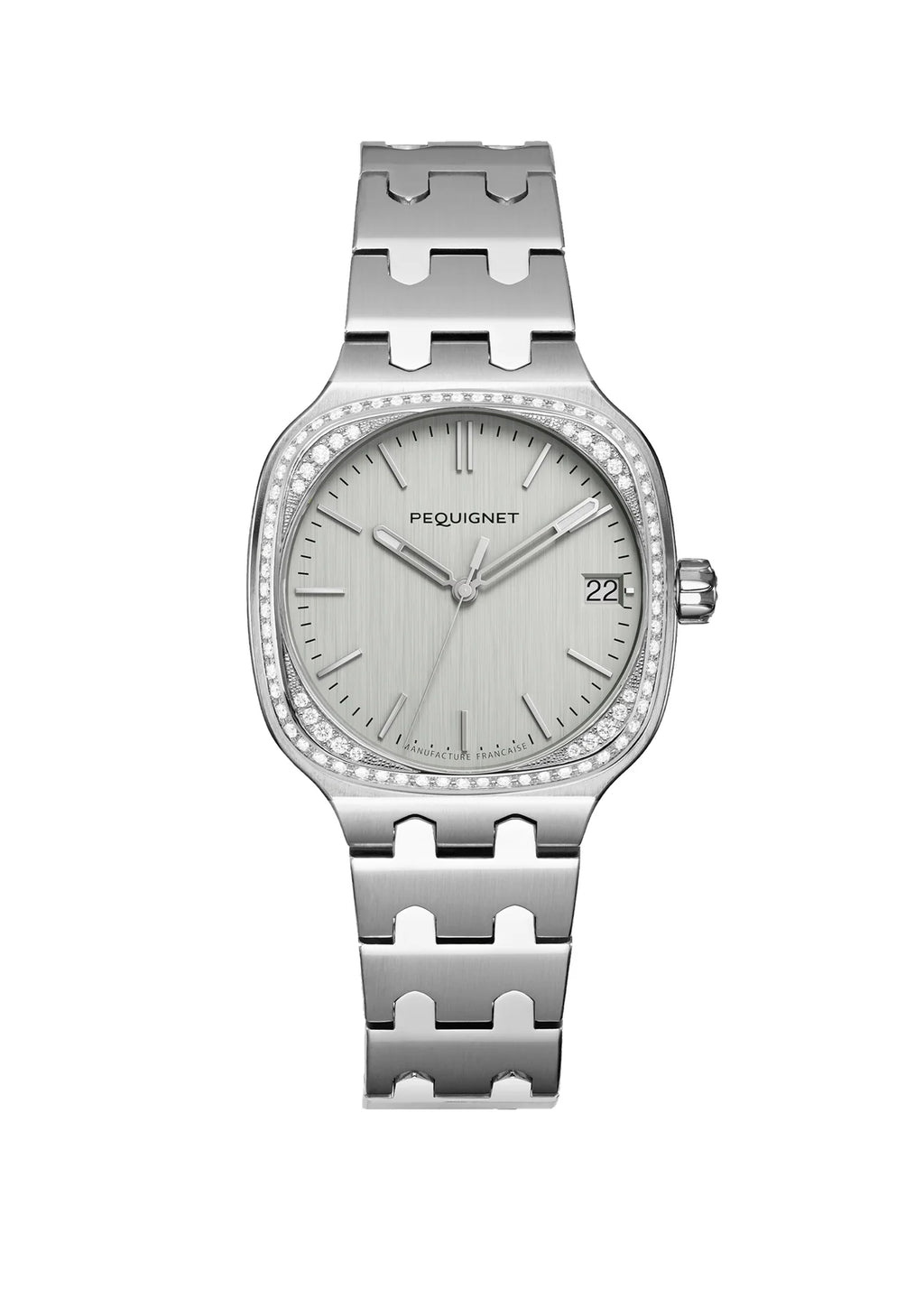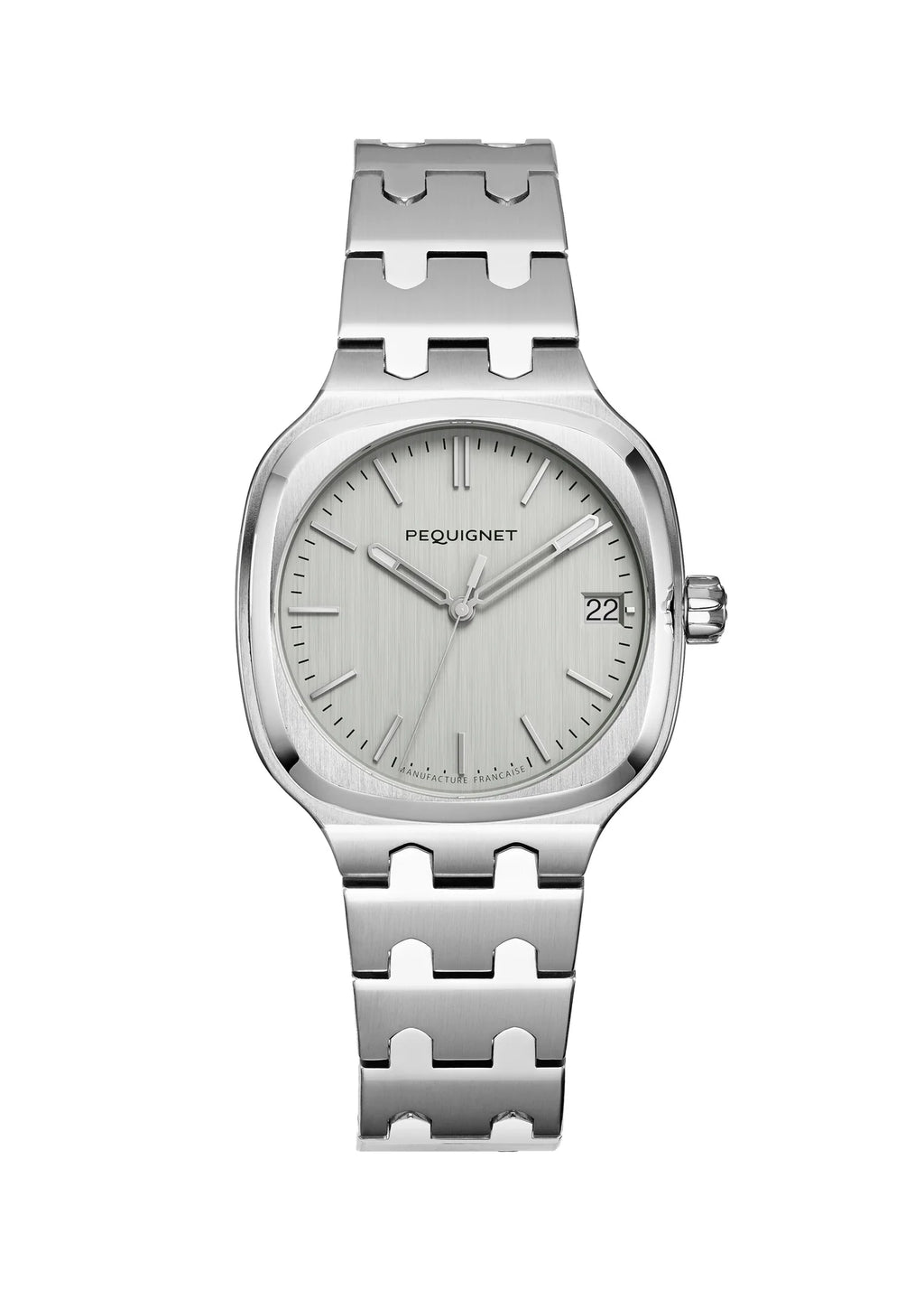 The Concorde adorns itself with a silver dial that subtly blends into its steel case, giving this streamlined model an elegant allure. With this sport-chic model, the French Manufacture Pequignet reinterprets all the strong codes of the Maison: steel, the signature link, and of course, a movement designed and assembled in France.