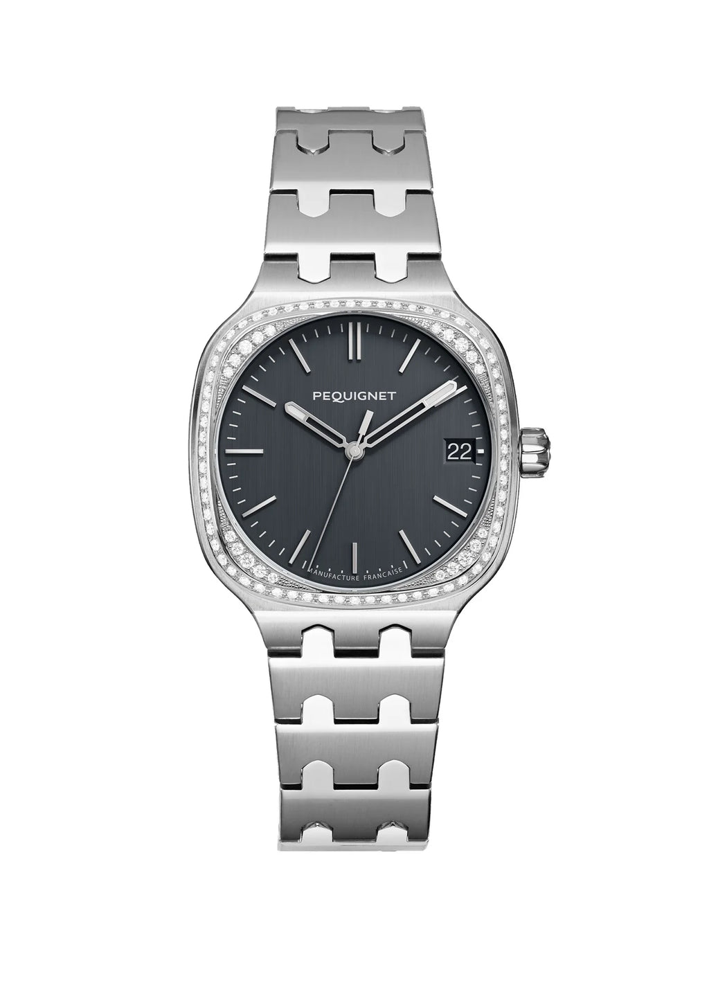 This refined version of the Concorde adorns a deep charcoal grey dial, illuminated by genuine diamonds adorning the entire bezel. With this sport-chic model, the French Manufacture Pequignet reinterprets all the strong codes of the Maison: steel, the signature link, and of course, a movement designed and assembled in France.