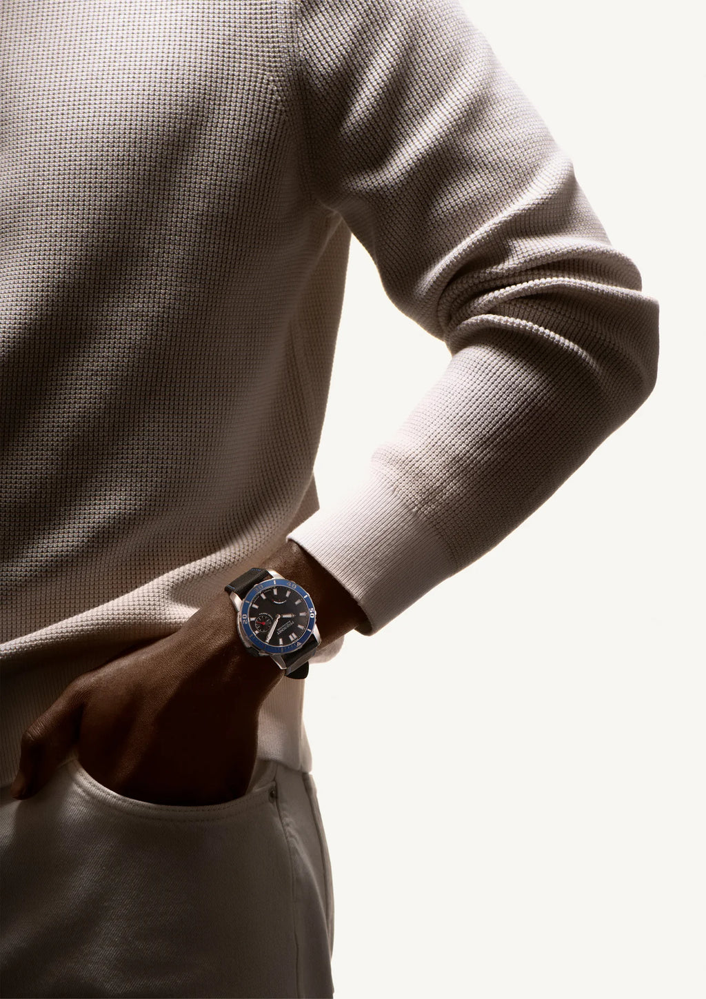 As solid and resistant as a diver's watch, yet as refined and sophisticated as a clock... The Extrême 300 scorns conventions and travels the world with distinction. This contrasting version, with its unidirectional black rubber-moulded swing bezel is very efficient. With its wide hands enhanced with luminova and luminova applique chapter rings on a black dial, this model offers optimal legibility in the depths of the ocean.