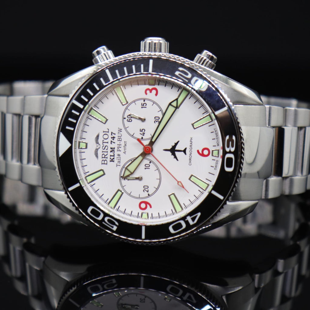 This modern timepiece features a carefully crafted stainless steel case and displays an original artifact from a KLM 747 airframe. The movement is a precision Swiss made chronograph with a Super Luminova dial protected by a scratch-resistant sapphire crystal. This design is limited to 1986 units in honor of the year KLM 747 Tail # PH-BUW entered service. The 747 was the original "Jumbo Jet" and has been considered the "queen of the skies" since it first entering service with Pan American Airlines in 1970. Now fading from passenger service, this aircraft holds a special place in the hearts of the countless passengers and crew that have flown aboard this icon.
